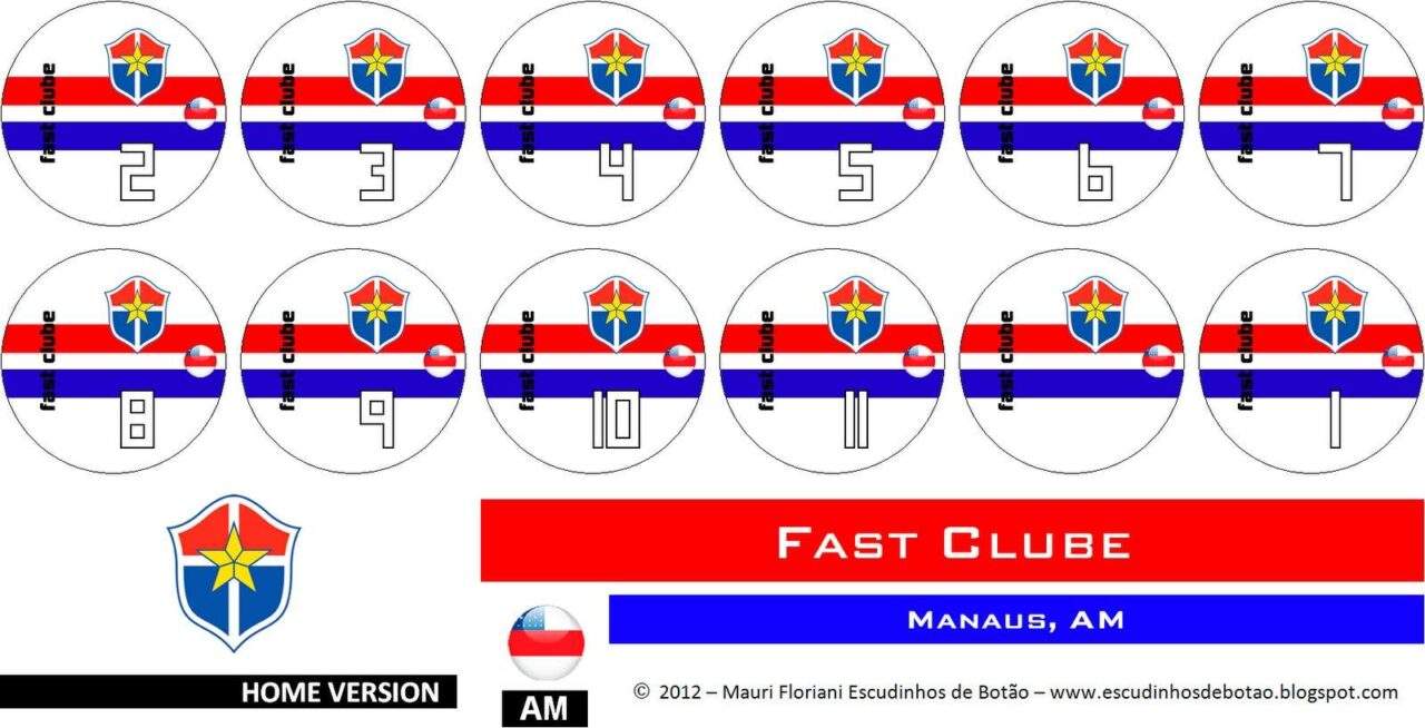 Para o escudinho do Fast Clube, optei por fazer duas faixas horizontais em vermelho e azul com uma faixa branca no meio, em fundo também branco. O nome do clube está na cor preta, bem como a numeração no estilo contorno.