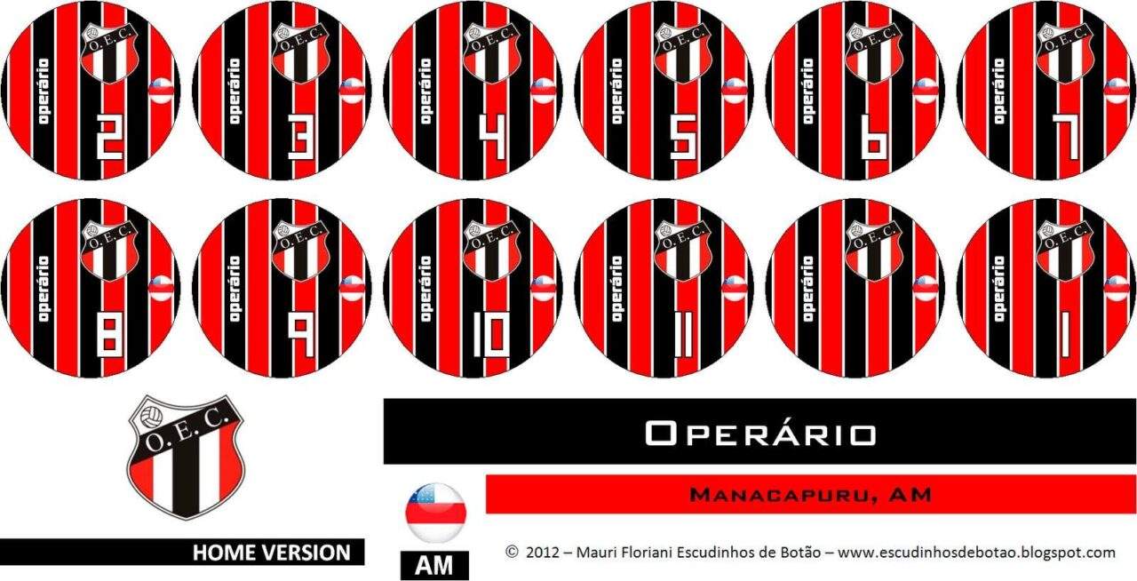 Essa é a cartela do Operário de Manacapuru – AM. Para esta postagem, o uniforme foi baseado no oficial do Operário, listrado na vertical em preto / vermelho / branco. O nome do clube em branco e a numeração no estilo contorno em preto / branco.