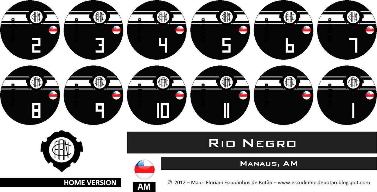 Para o escudinho do Rio Negro, optei por fazer um fundo em uma tonalidade mais clara do preto, com faixa horizontal em preto 100% na altura do escudo, mesma cor do nome do clube. A numeração está no estilo contorno em preto / branco.