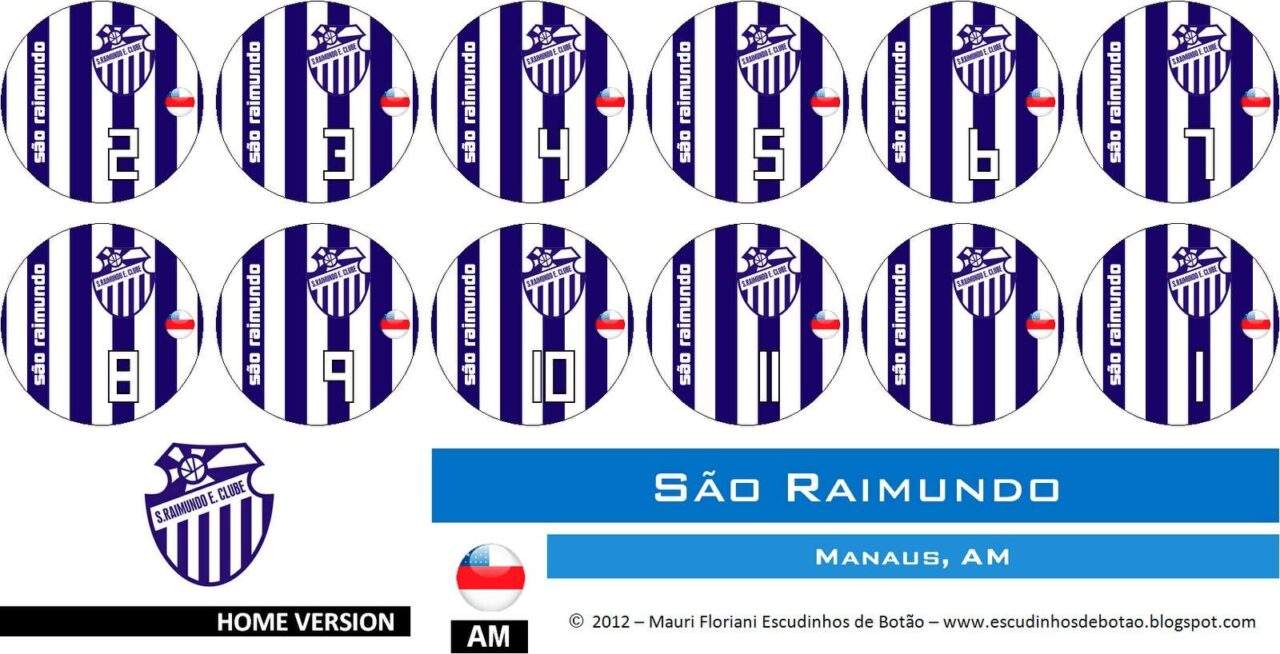O escudinho do São Raimundo segue o uniforme original, com listras verticais nas cores azul e branco, tendo o nome do clube em branco e a numeração no estilo contorno em preto / branco, para contrastar.