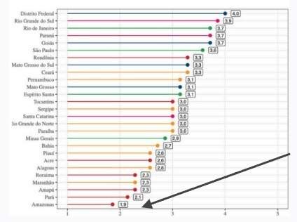 O Distrito Federal aparece no topo da lista, com índice 4,00 — bem acima da média nacional. Já o Amazonas registrou 1,86, a pior nota do país. Pará, Roraima e Amapá também figuram nas últimas posições.