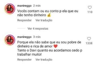 Mani Reggo, esposa do BBB Davi, se manifestou nas redes sociais após a idade dela virar pauta em uma conversa entre Pitel, Rodriguinho, Luigi e Giovanna. Durante o bate papo os brothers ficaram surpresos após ser falado sobre o fato de Davi ser casado com uma mulher 20 anos mais velha que ele