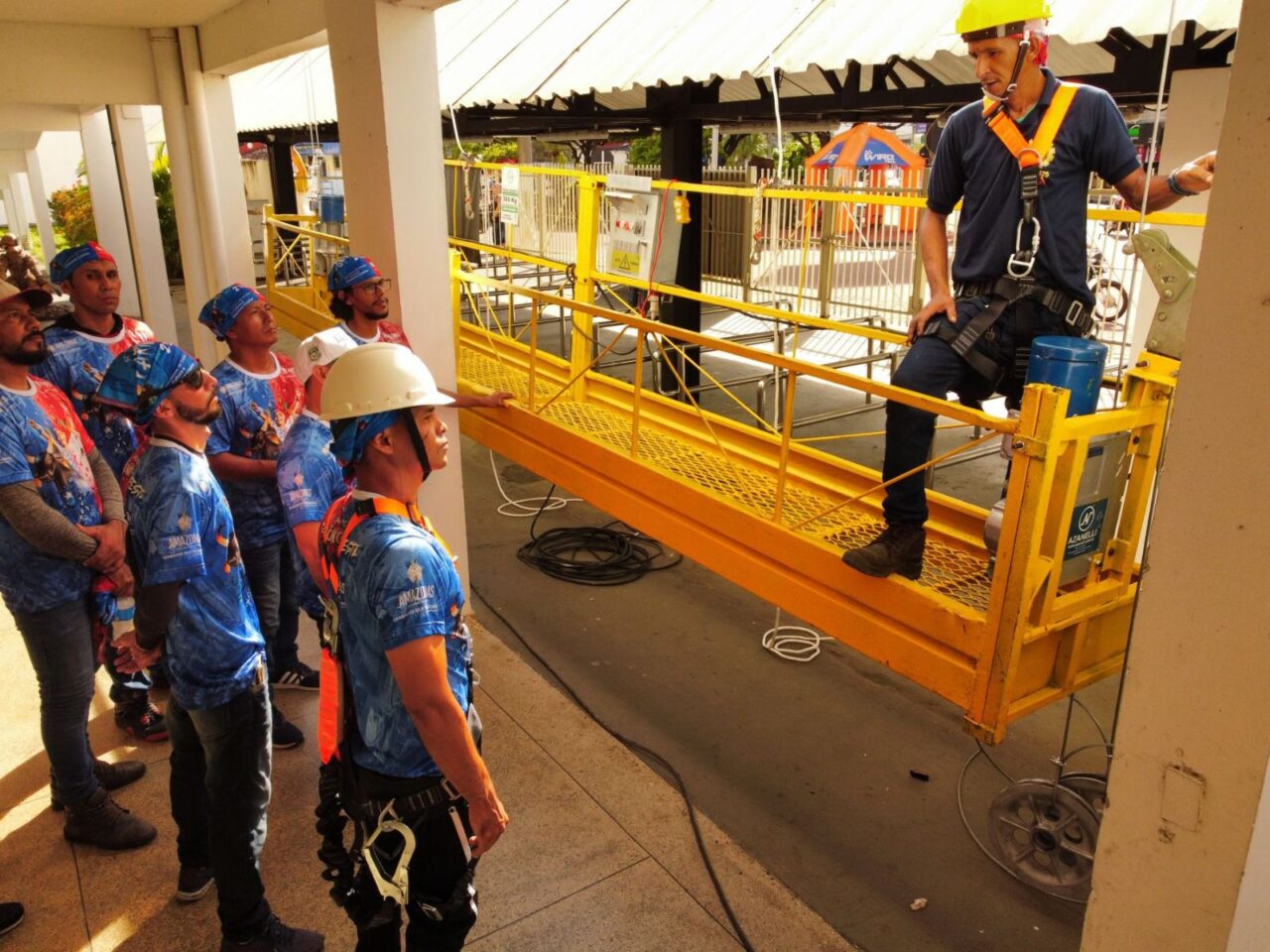 Após receber as instruções de segurança e de estrutura dos equipamentos de suspensão, a equipe formada por mais de 20 artistas parintinenses, se dedica a dar vida à obra “Patrimônio em Festa”, de Pito Silva, contemplado no edital Mural Bumbódromo 2024, do Governo do Estado, por meio da Secretaria de Cultura e Economia Criativa.
