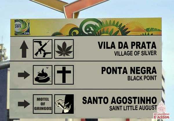 Faltando menos de 6 meses para o início dos jogos mundiais da FIFA 2014, as placas bilíngues que servirão para orientar a vida dos turistas que decidirem vir à Manaus, já chegaram! Abaixo é possível ver algumas delas e já as suas traduções.