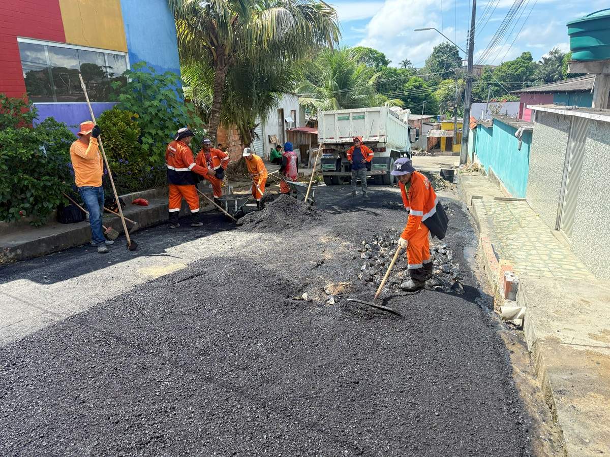 Uma frente de obra trabalha empenhada na recuperação da travessa Álvaro Maia. Além de aplicar o asfalto, os trabalhadores contam com o apoio de uma retroescavadeira e pedra rachão, para fortalecer ainda mais o pavimento. A dona de casa Diana Alvarenga, 30, se surpreende ao buscar a sua filha na escola e ver a rua que serve de acesso para a sua casa recebendo infraestrutura.