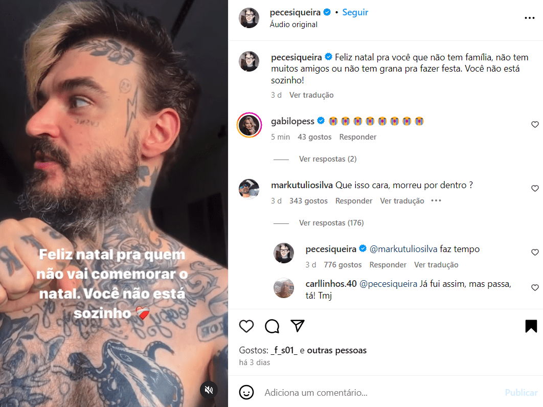 No próprio perfil no Instagram, PC Siqueira postou um vídeo no domingo, 24, desejando feliz Natal aos seguidores. “Feliz Natal solitário pra você”, disse. A postagem foi então o último registro do youtuber na rede social.