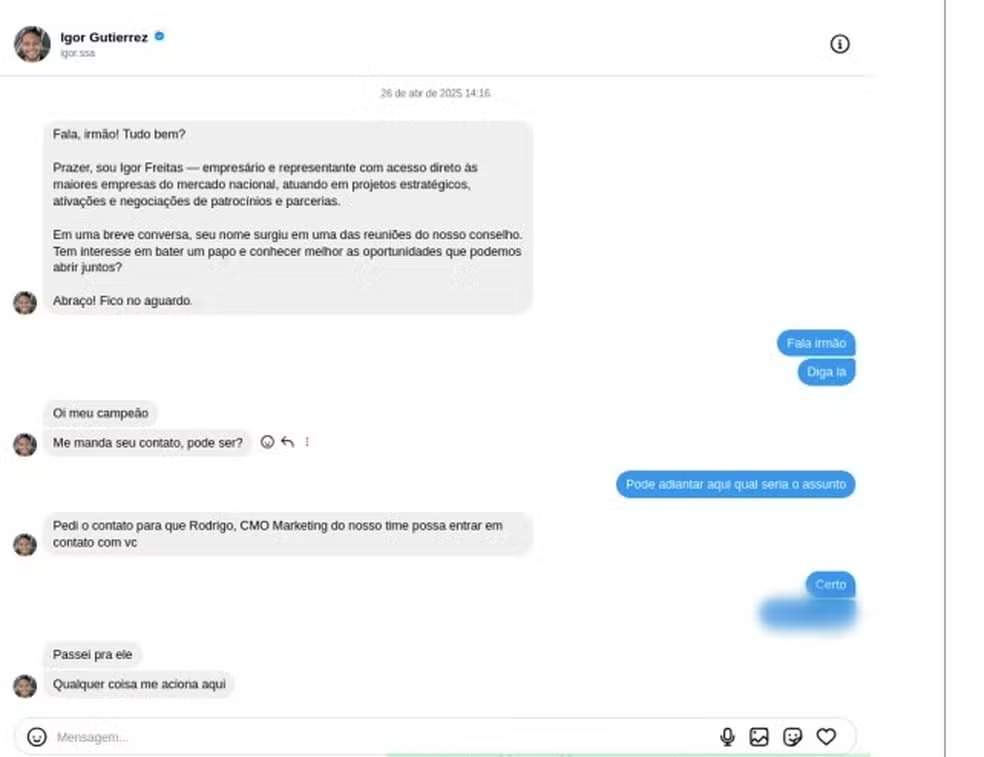 As investigações apontam que Igor Freitas fez o contato inicial via Instagram, apresentando-se como empresário com acesso a grandes empresas e projetos estratégicos. Após obter o contato telefônico de um dos atletas, Rodrigo Reis teria enviado um áudio prometendo a quantia para que o jogador recebesse o cartão amarelo. A mensagem era de visualização única e não pôde ser reproduzida, mas prints e o depoimento do atleta confirmam a proposta recusada.