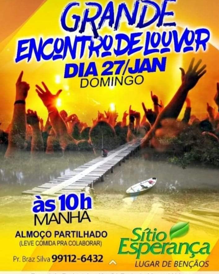 O jornalista e ex-vereador de Manaus Braz Silva, convida todos os que precisam de uma palavra de esperança para participar do Grande Encontro de Louvor, que será realizado no dia 27/01/2019, a partir das 10h, no Sítio Esperança, localizado a 21 km de Manaus, no município de Iranduba.