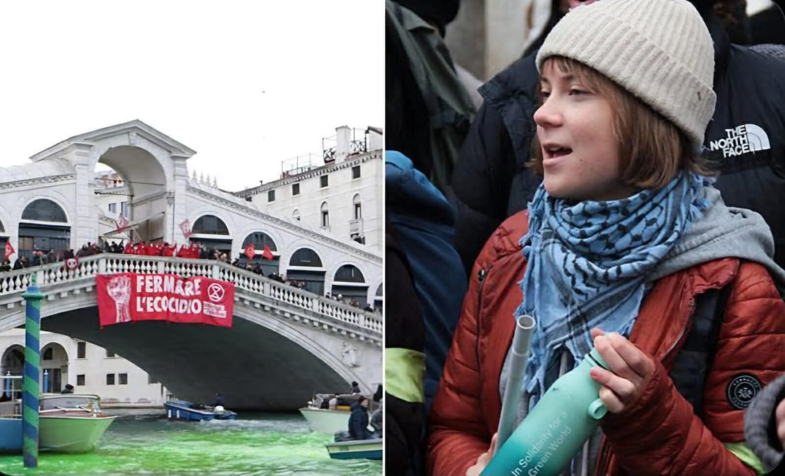 Enquanto Greta discursava na Ponte de Rialto, segurando uma faixa com os dizeres “Parem o Ecocídio”, cinco manifestantes em um barco despejavam litros de corante fluorescente verde nas águas do canal.