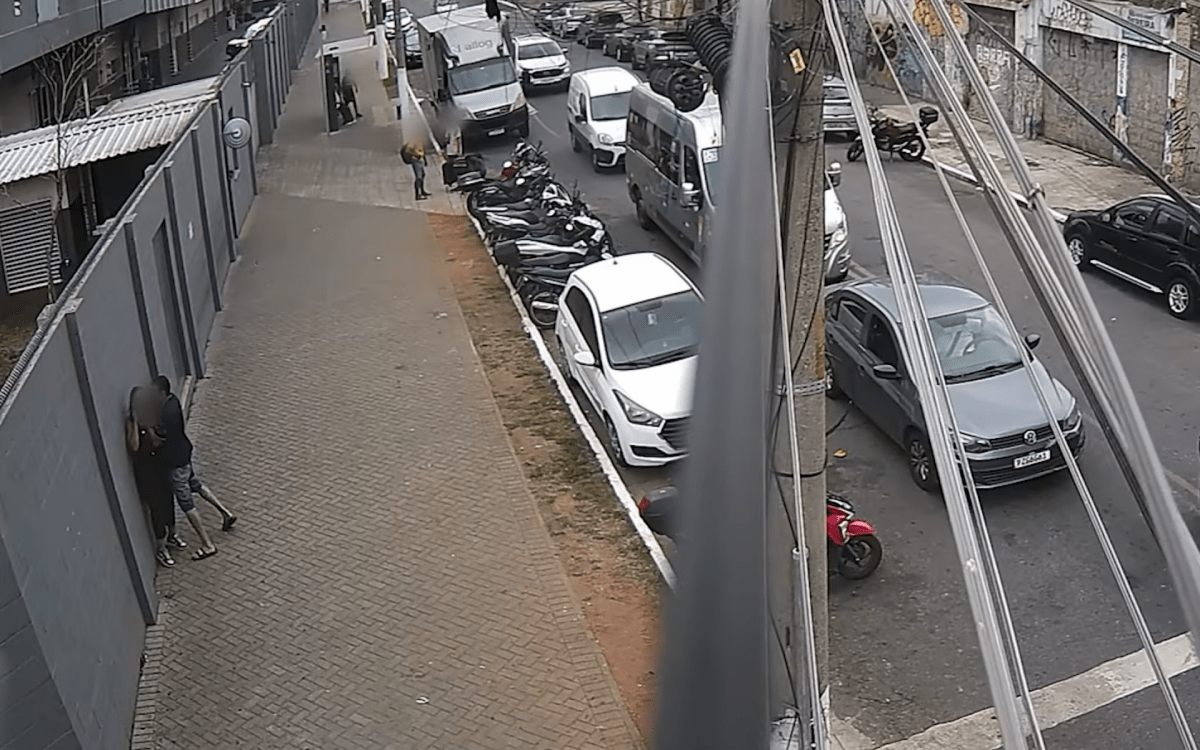 As imagens mostram o suspeito abordando a vítima na calçada, levando-a até um muro e desferindo agressões, chegando a derrubá-la e enforcá-la.