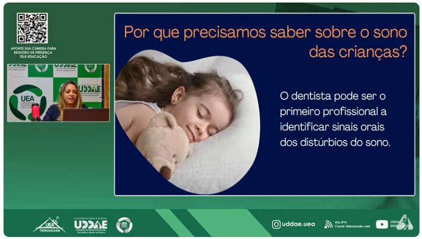 Tratando do tema “Higiene do sono”, a palestra destacou a influência recíproca entre o sono e a saúde bucal, pontuando a importância do descanso noturno para a criança e indicando sinais de problemas a que pais e profissionais da educação e da saúde devem estar atentos a fim de assegurar a saúde integral infantil. O evento on-line foi realizado em parceria com a Universidade do Estado do Amazonas (UEA).