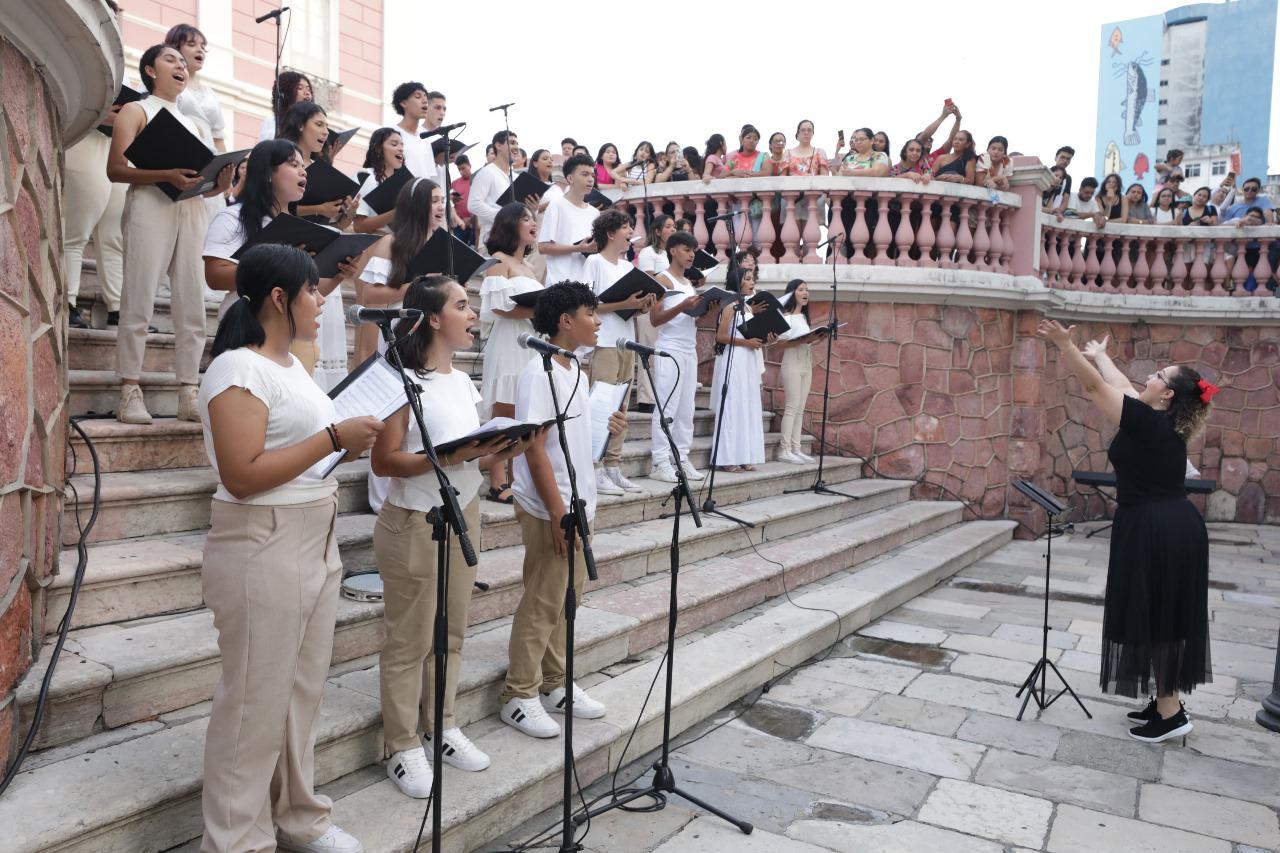 Antes da iluminação da árvore, o Coral Infantojuvenil do Liceu de Artes e Ofícios Claudio Santoro encantou o público com uma apresentação nas escadarias traseiras do Teatro Amazonas, na qual entoou canções natalinas clássicas e contemporâneas.