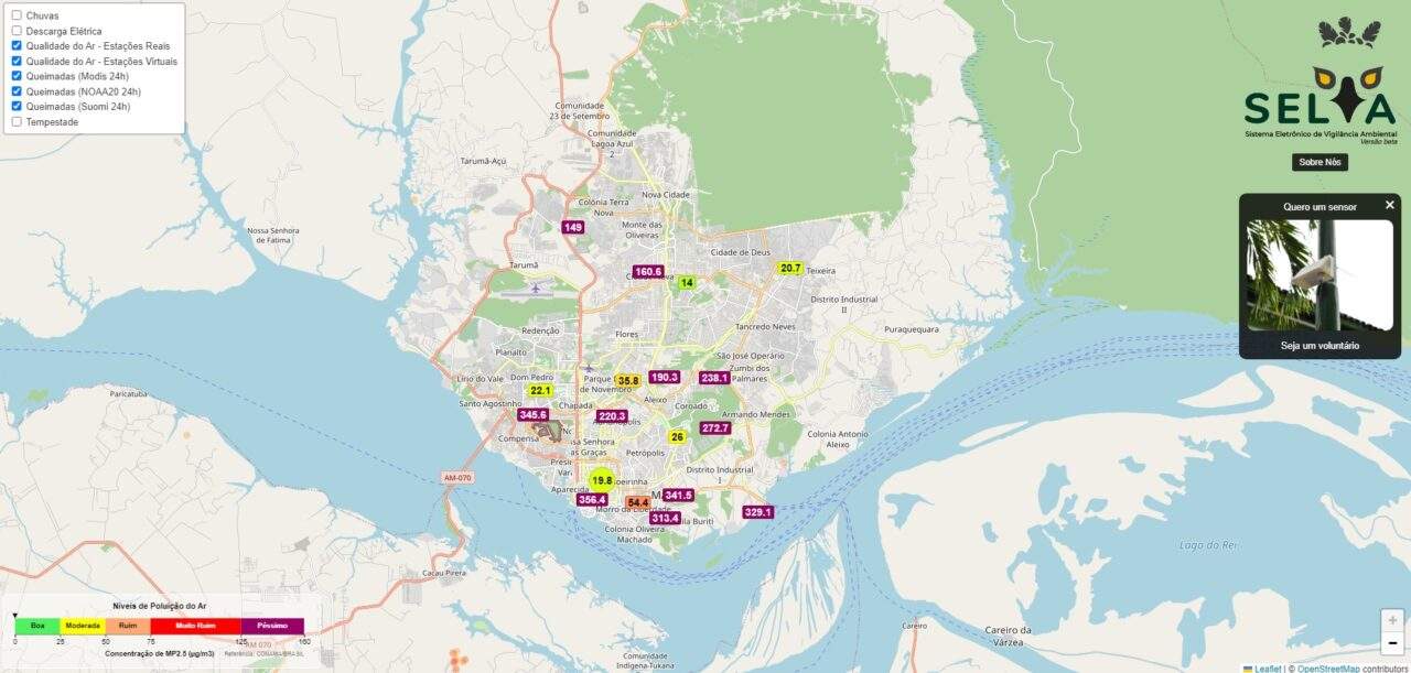 Os índices de qualidade do ar podem ser conferidos em tempo real pelo Sistema Eletrônico de Vigilância Ambiental (Selva), que possui sensores instalados em vários pontos de Manaus.