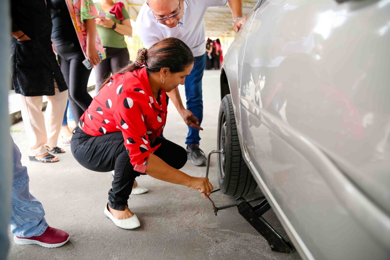 Já no último sábado, ficou marcado pela aula prática, onde foi ensinado como trocar o pneu, onde posicionar de forma correta o triângulo de sinalização do veículo, além de identificar as luzes no painel do veículo.