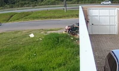 Câmeras de monitoramento flagraram o momento exato que um jovem perdeu o controle da motocicleta que pilotava e deu de cara contra o muro de uma...