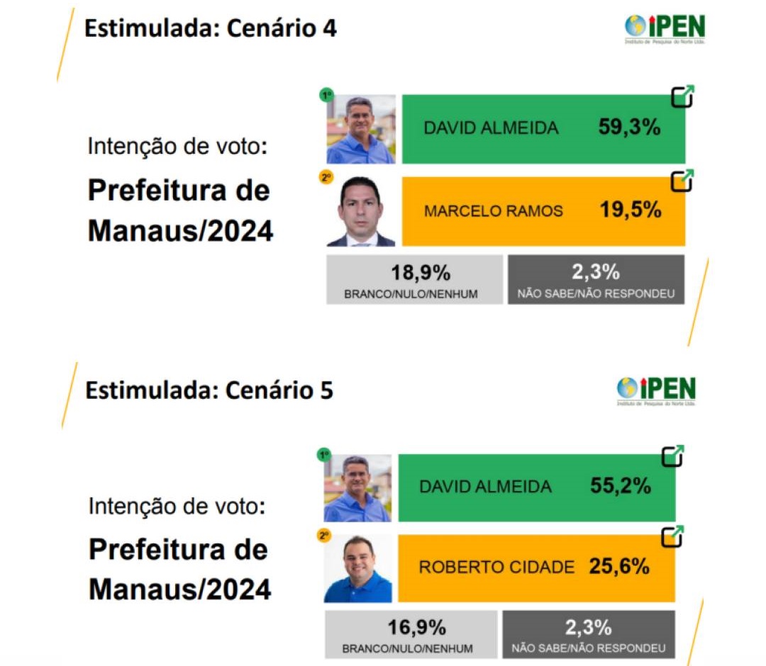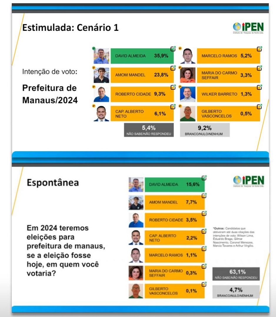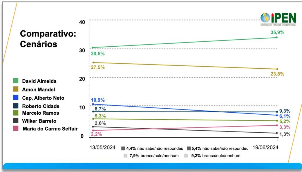 A pesquisa revela que David Almeida, que em maio tinha 30,5% das intenções de voto, cresceu para 35,9%, possivelmente devido ao aumento de sua visibilidade em eventos e inaugurações. Amom Mandel viu sua popularidade cair de 27,5% para 23,8%, em meio a críticas intensas nas redes sociais. Alberto Neto, que esperava apoio do ex-presidente Jair Bolsonaro, sofreu uma queda de quase 5%, passando de 10,9% para 6,1%.