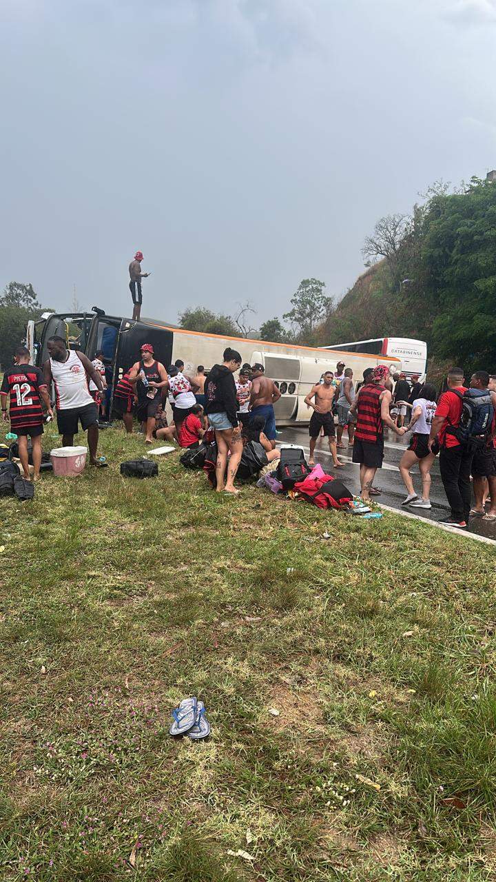 Ônibus da torcida do Flamengo capota em Volta Redonda a caminho da semifinal da Libertadores; veja vídeo