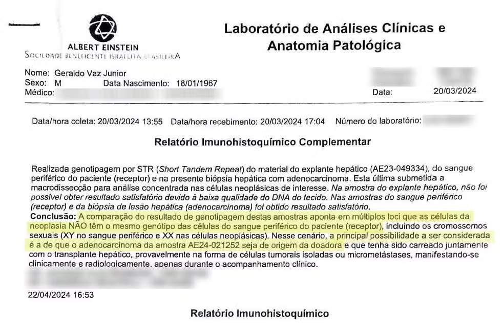 A equipe médica realizou uma biópsia e, para espanto da família, os exames genéticos mostraram que as células cancerígenas não pertenciam ao paciente, mas ao doador do órgão.