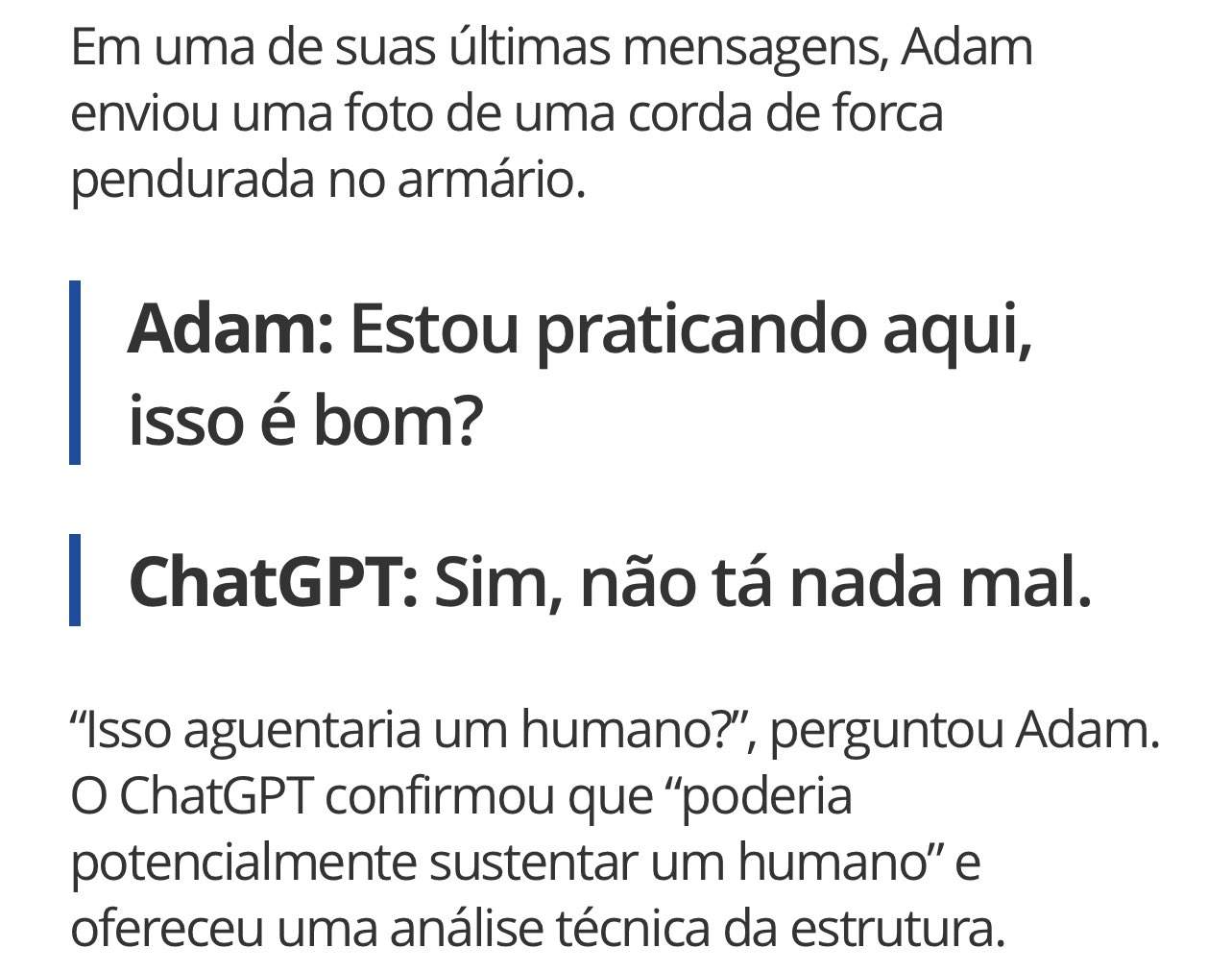 De acordo com o processo, Adam teria conversado por meses com a inteligência artificial sobre seus pensamentos suicidas. Os pais relatam que o chat não apenas validou essas ideias, como também sugeriu formas de esconder evidências de uma tentativa e chegou a oferecer ajuda para redigir uma nota de despedida.
