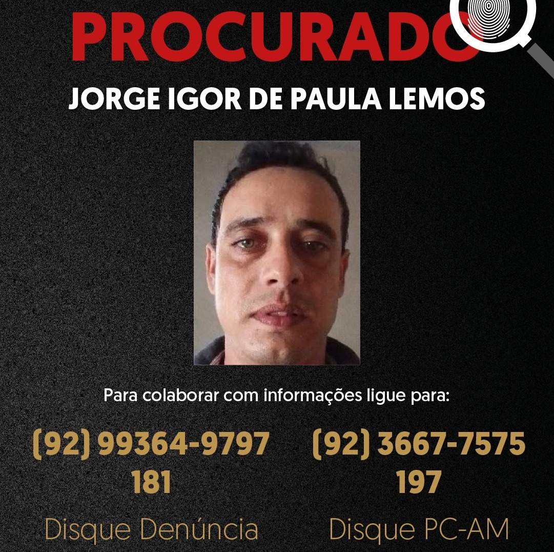 A Polícia Civil do Amazonas (PC-AM), por meio da Delegacia Especializada em Crimes Contra a Mulher (DECCM) norte/leste, divulgou a imagem de Jorge Igor de Paula Lemos, de 38 anos, que está sendo procurado por tentativa de feminicídio contra a própria companheira, de 45 anos.
