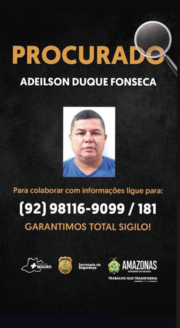 A PC-AM solicita que qualquer pessoa com informações sobre o paradeiro de Adeilson Duque Fonseca entre em contato pelos números (92) 98116-9099, do disque-denúncia do 1º DIP, ou 181, da Secretaria de Estado de Segurança Pública (SSP-AM). A identidade do informante será mantida em sigilo.
