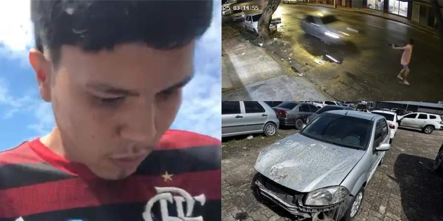 Imagens de câmeras de segurança mostram o momento em que o jovem caminha pela via e é atingido pelas costas por um veículo prata que trafegava em alta velocidade.