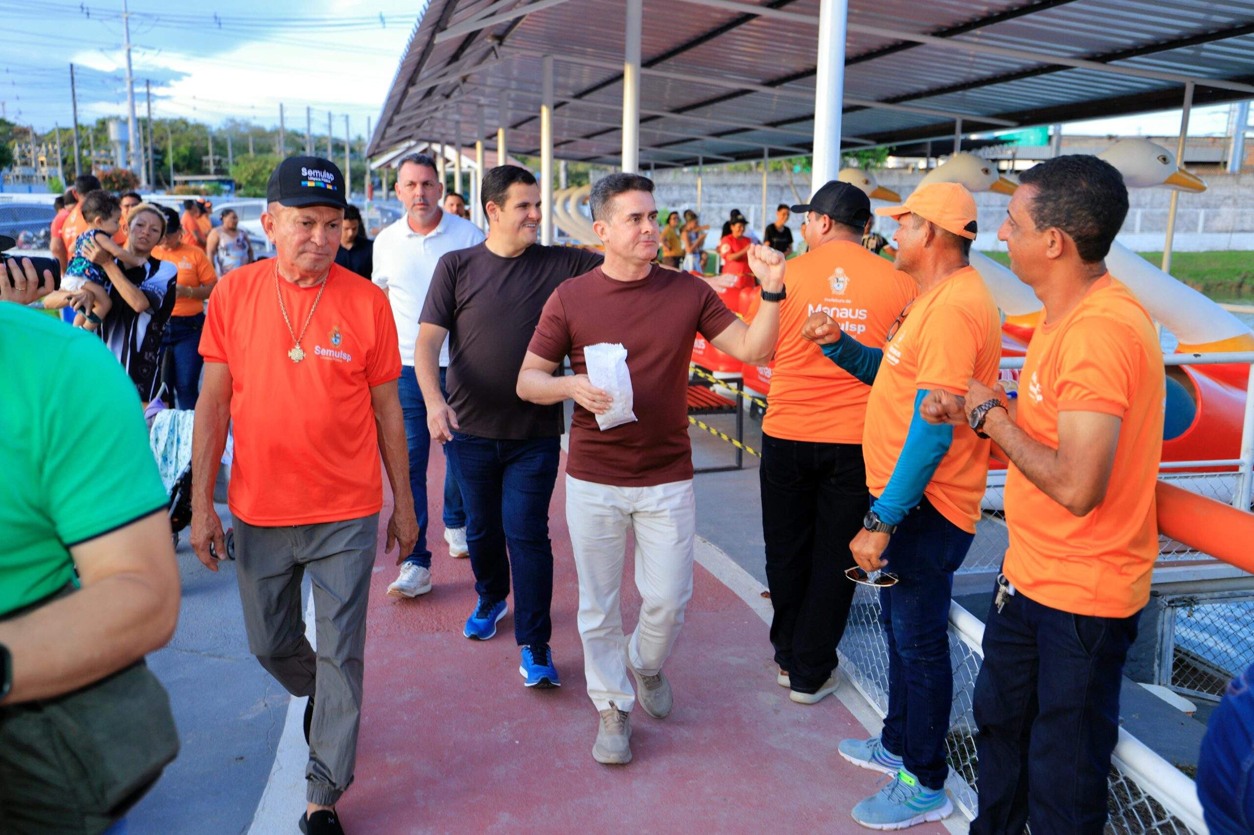 O prefeito de Manaus, David Almeida, acompanhado do vice-prefeito Renato Junior e do titular da Secretaria Municipal de Limpeza Urbana (Semulsp), Sabá Reis, realizou mais uma visita à lagoa do Bombeamento, no bairro Compensa, zona Oeste, onde vistoriou o avanço dos serviços de revitalização pela Semulsp.