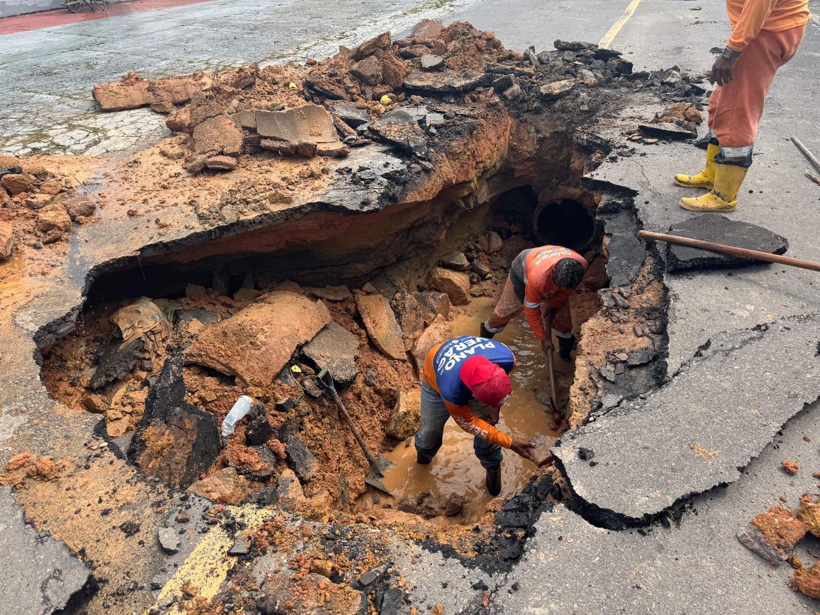 A Prefeitura de Manaus, por meio da Secretaria Municipal de Infraestrutura (Seminf), realizou na quarta-feira, 21/1, uma intervenção emergencial na rua Waldemar Pereira de Souza, no bairro Planalto, zona Centro-Oeste da capital. A ação teve como objetivo a recuperação do sistema de drenagem da via, após o rompimento de um trecho da rede provocado pela sobrecarga causada pelo intenso volume de chuvas registrado no dia.