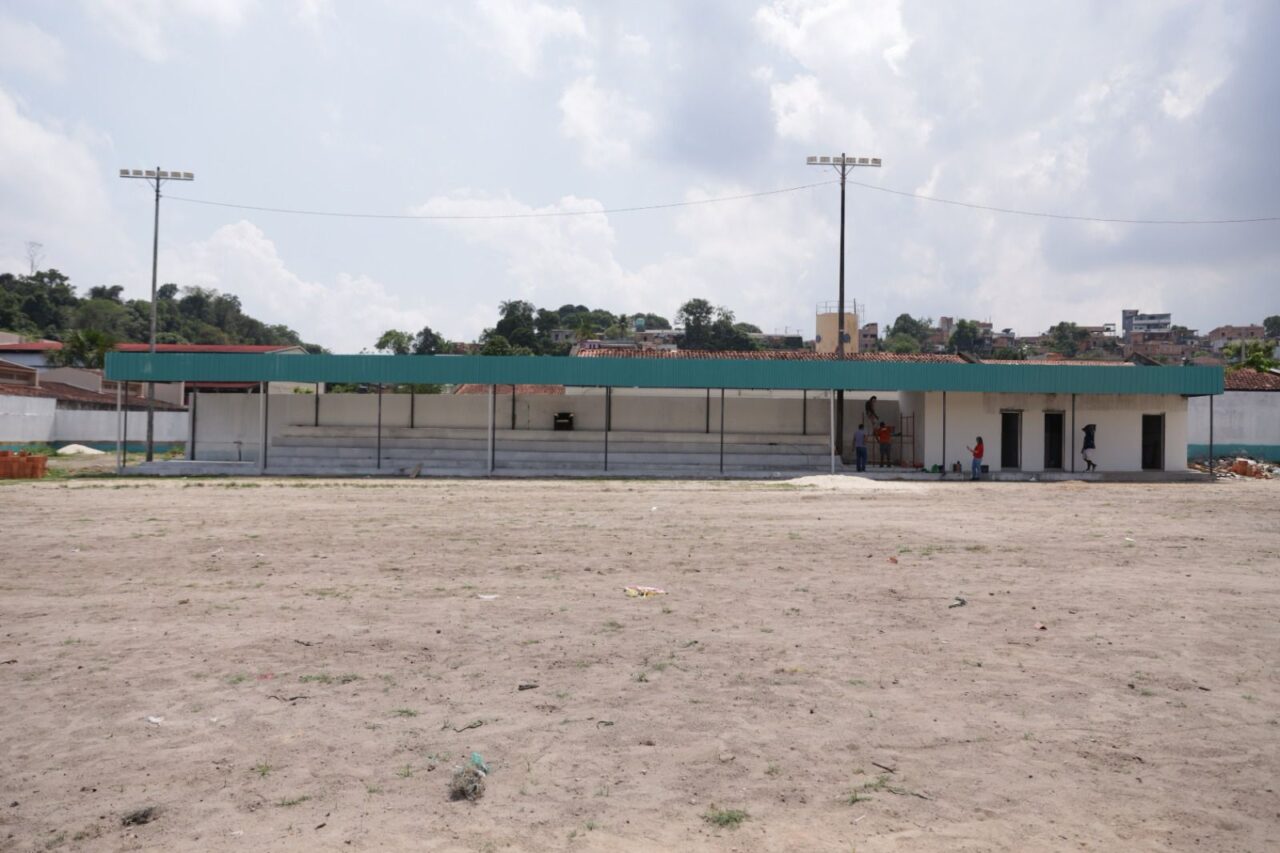A equipe já executou os serviços de terraplanagem do campo, calçada e arquibancada. Agora, as obras estão avançando na construção da cobertura metálica e na implantação de banheiros masculino, feminino e para pessoas com deficiência física.