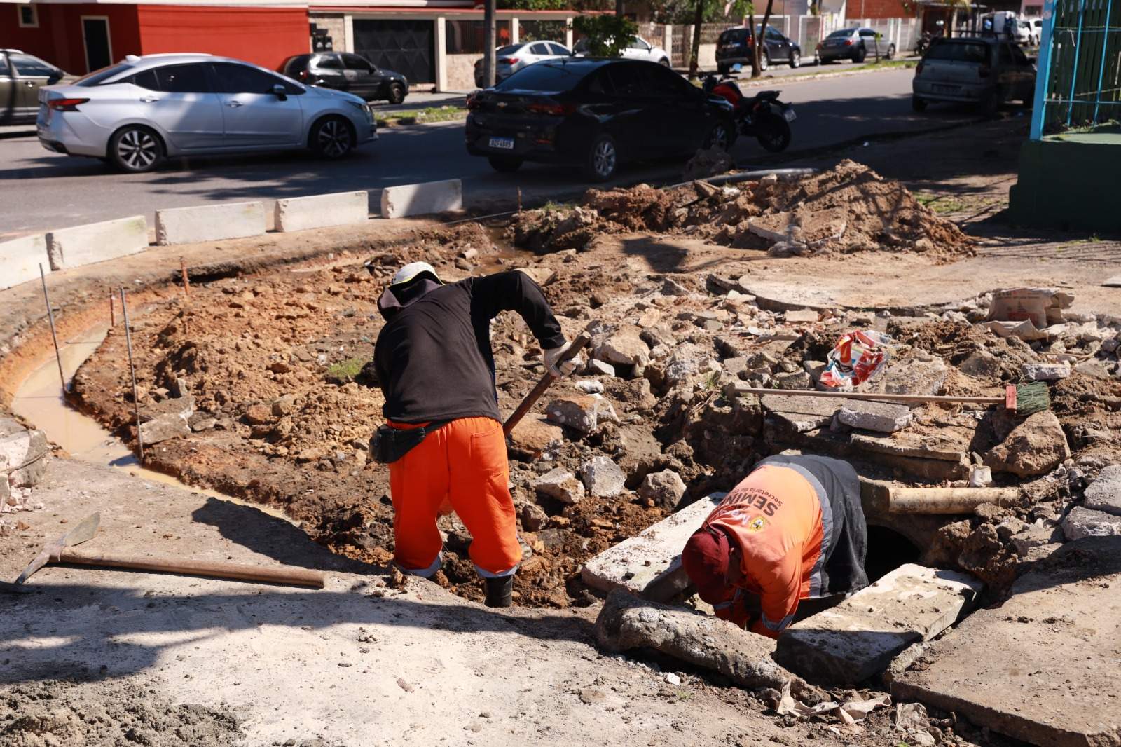 Após a reestruturação da drenagem, a Seminf deu continuidade à obra com a recuperação da calçada e a implantação de meio-fio, essencial para conter a pavimentação e direcionar corretamente o fluxo da água da chuva.