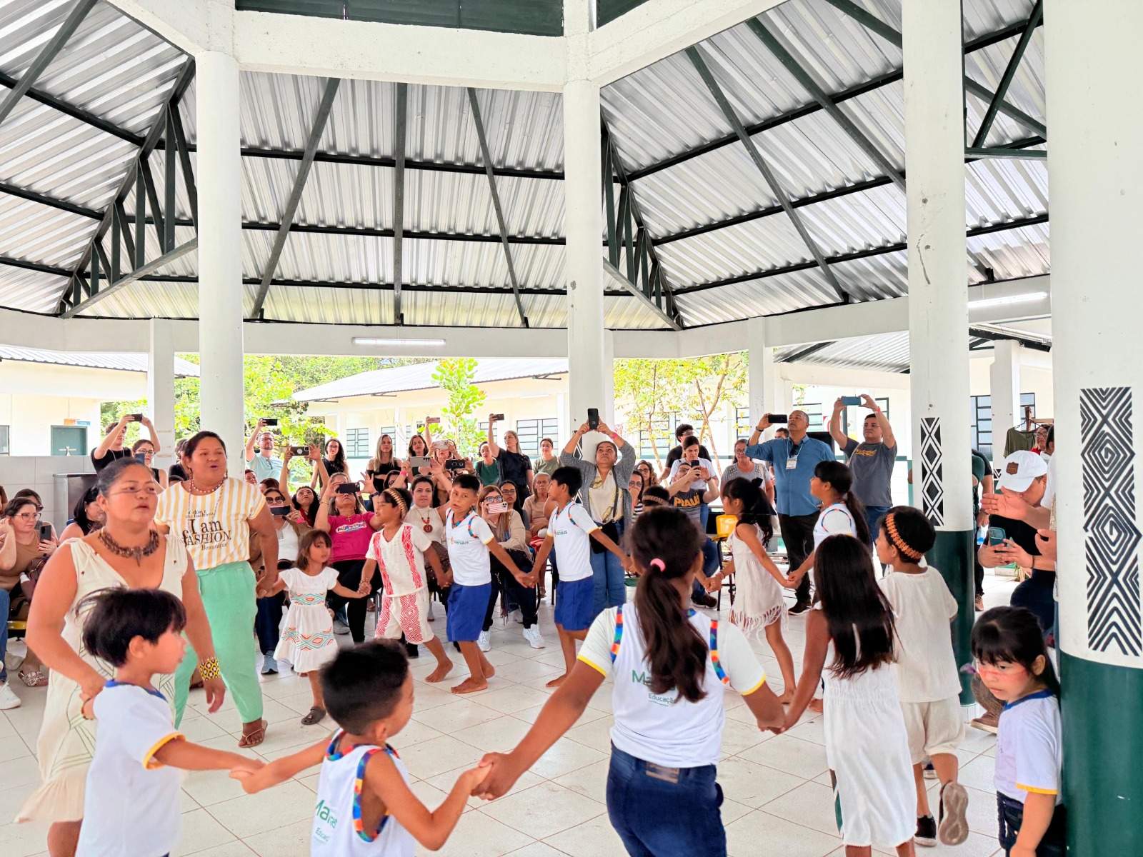 Durante a agenda, a comitiva visitou a escola indígena municipal Kanata T-Ykua, localizada na comunidade Três Unidos, na zona rural de Manaus. A unidade foi escolhida por ser um exemplo de ensino que valoriza a cultura local e promove a inclusão.