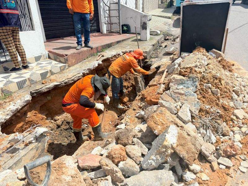 O serviço é executado de forma manual por uma equipe formada por 10 trabalhadores, realinhando cerca de seis metros da tubulação da rua, onde foi rompida, causando a fuga de material e abertura de uma cratera na via.