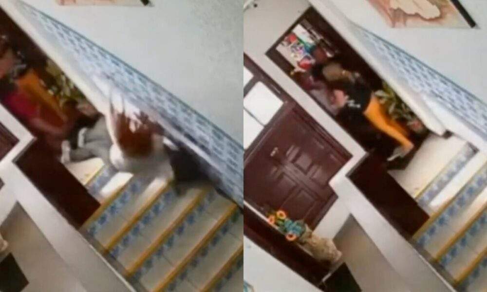 Um vídeo feito por câmeras de segurança flagrou o exato momento que uma idosa de 70 anos foi empurrada de uma escada durante uma discussão com...