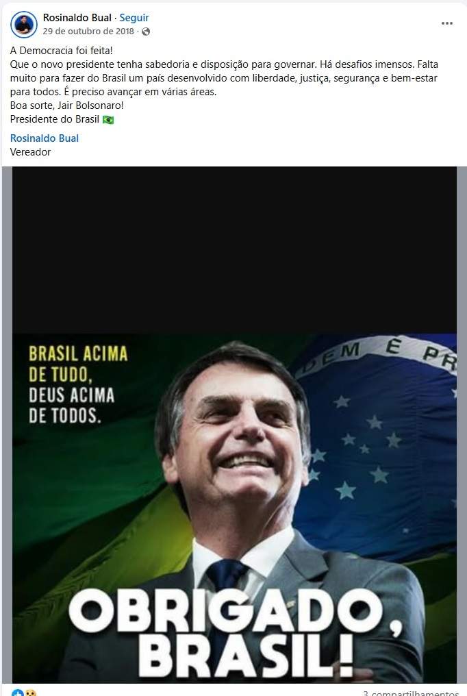 Internautas resgataram uma publicação antiga do vereador de Manaus, Rosinaldo Bual (Agir), em que ele parabenizava Jair Bolsonaro pela vitória presidencial de 2018. Na ocasião, Rosinaldo Bual escreveu que “a democracia foi feita” e desejou sabedoria ao então presidente para enfrentar os desafios do Brasil, destacando áreas como justiça, segurança e bem-estar.