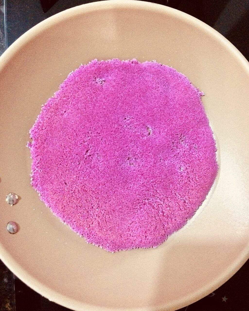 - Coloque cerca de 3 a 4 colheres de sopa da goma rosa na frigideira e espalhe formando um disco fino.