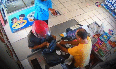 Imagens de segurança mostram dois homens em uma motocicleta chegando ao local. Um dos criminosos desce do veículo, entra no restaurante e, de forma agressiva, anuncia o assalto. Armado, ele rende clientes e funcionários enquanto o comparsa permanece do lado de fora, dando cobertura para a fuga.