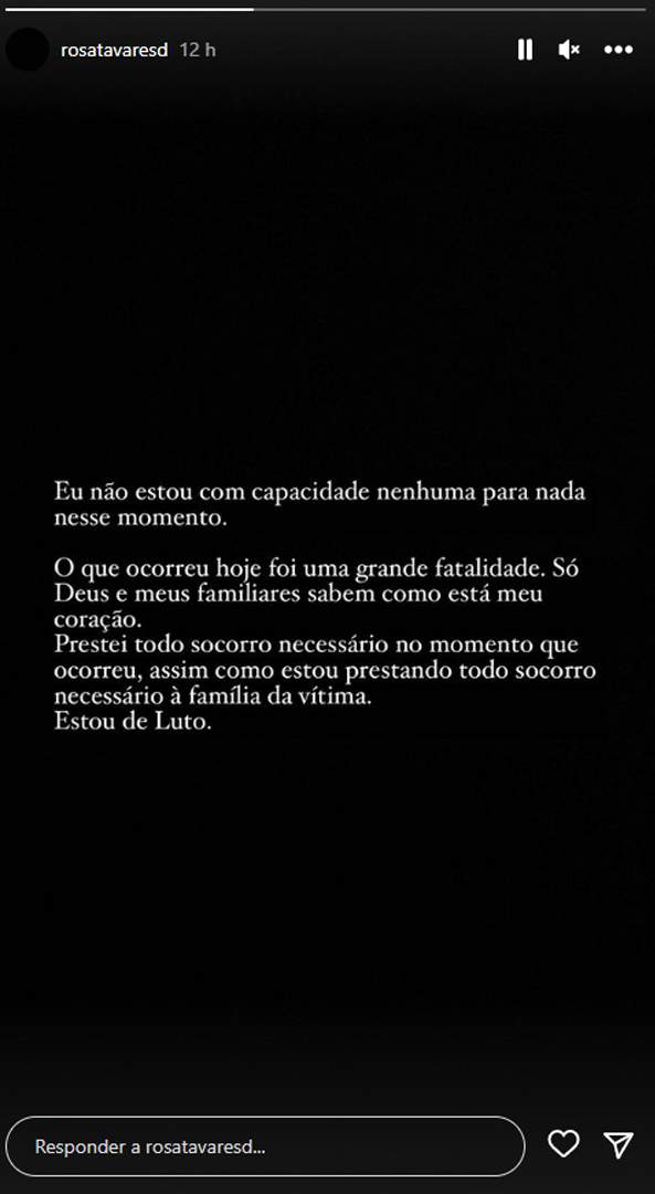 “Eu não estou com capacidade nenhuma para nada neste momento”, escreveu. “O que ocorreu hoje foi uma grande fatalidade. Só Deus e meus familiares sabem como está meu coração”, completou.