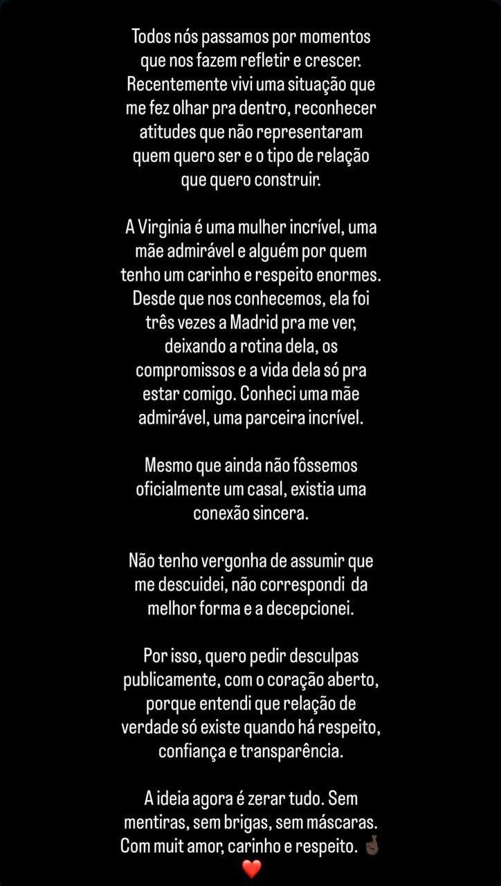 Virginia já havia confirmado que os dois decidiram não seguir com o affair, mas demonstrou respeito pelo atleta. A postura de Vini repercutiu rapidamente nas redes sociais, com muitos internautas elogiando a atitude do jogador em reconhecer seus erros de forma madura e pública — algo raro no meio dos famosos.